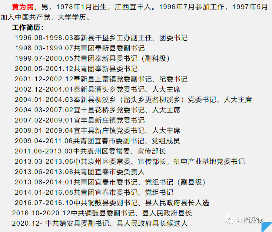 2020年12月31日上午,宜春市靖安县召开领导干部大会,宜春市委组织部二级巡视员敖连芽同志到会并宣布省委和市委关于靖安县政府主要负责同志任职的决定:黄为民同志任中共靖安县委委员、常委、副书记,提名为靖安县人民政府县长候选人。