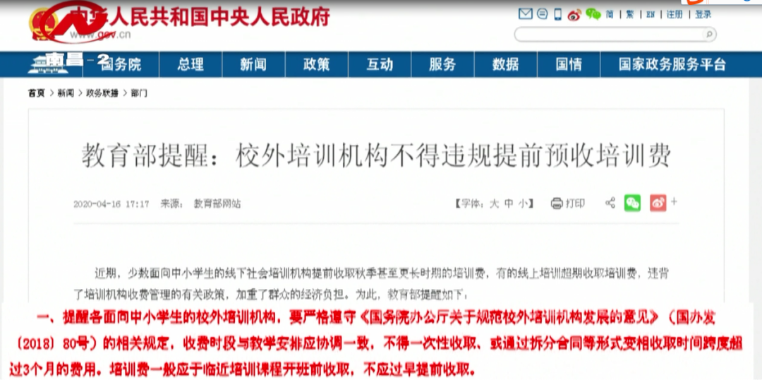 2020年4月,教育部提醒中小学生的校外培训机构,要严格遵守《国务院办公厅关于规范校外培训机构发展的意见》的相关规定,收费时段与教学安排应协调一致,培训费一般应于临近培训课程开班前收取,不应过早提前收取。显然该做法与规定相悖。