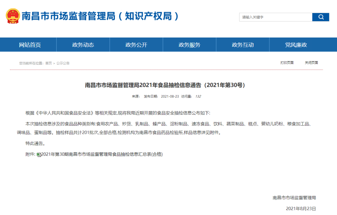 2021年第31期南昌市市场监督管理局食品抽检信息汇总表(合格)