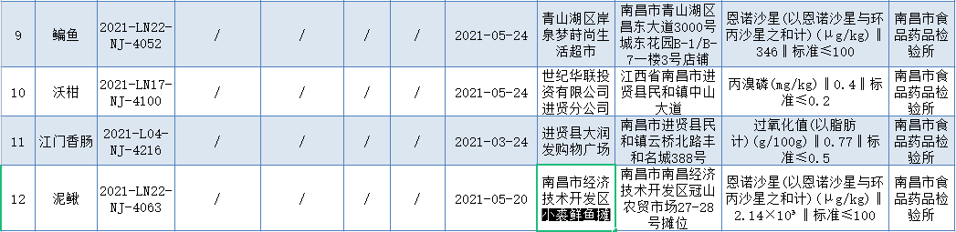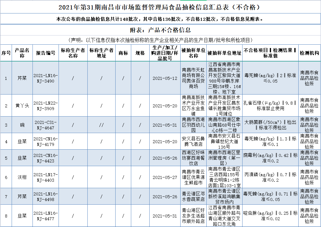 2021年第31期南昌市市场监督管理局食品抽检信息汇总表(不合格)