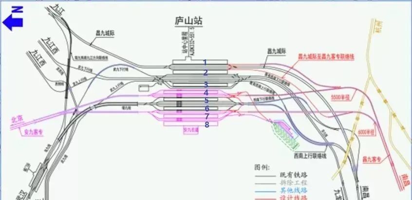 8台25线的具体含义就是8个站25股线。共分成四个场:昌九城际场2台4线(内侧1台与京九普速场共用),京九普速场2台8线,武九客专场2台6线,京九高速场(图中粉红色)3台9线(最内侧两条到发线与武九客专场共用)。