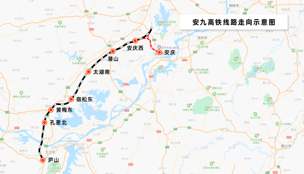 安九高铁北起安徽安庆西站,南至江西九江的庐山站,正线全长198公里,设计时速350公里,是国家“八纵八横”高速铁路网京港(台)通道的项目之一。