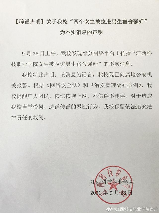 28日下午,江西科技职业学院发布辟谣声明,9月28日上午,学校发现部分网络平台上传播“江西科技职业学院女生被拉进男生宿舍强奸”的不实消息。学校特此声明:该消息为谣言,学校现已向属地公安机关报警。根据《网络安全法》和《治安管理处罚条例》,学校提醒广大网民,依法依规上网,不信谣不传谣。对于造成我校声誉受损、造谣传谣的恶性行为,我校保留依法追究法律责任的权利。
