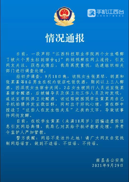 9月29日,南昌县公安局发布情况通报称,日前,一段声称“江西科技职业学院两个女生喝醉了被六个男生拉到宿舍qj”的短视频在网上流传,引发网友关注。获悉此情后,该局迅速组织相关部门进行调查处理。