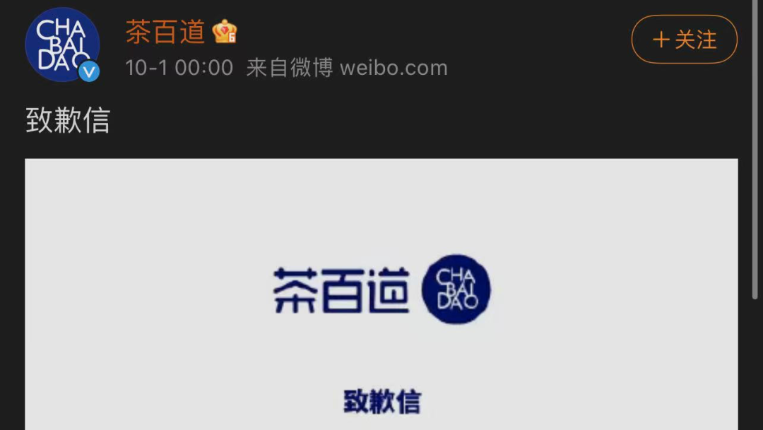 茶百道官方微博10月1日凌晨发布致歉信称,将对所有店铺进行全面排查,严格整改,不符合要求的门店一律采取闭店处理。