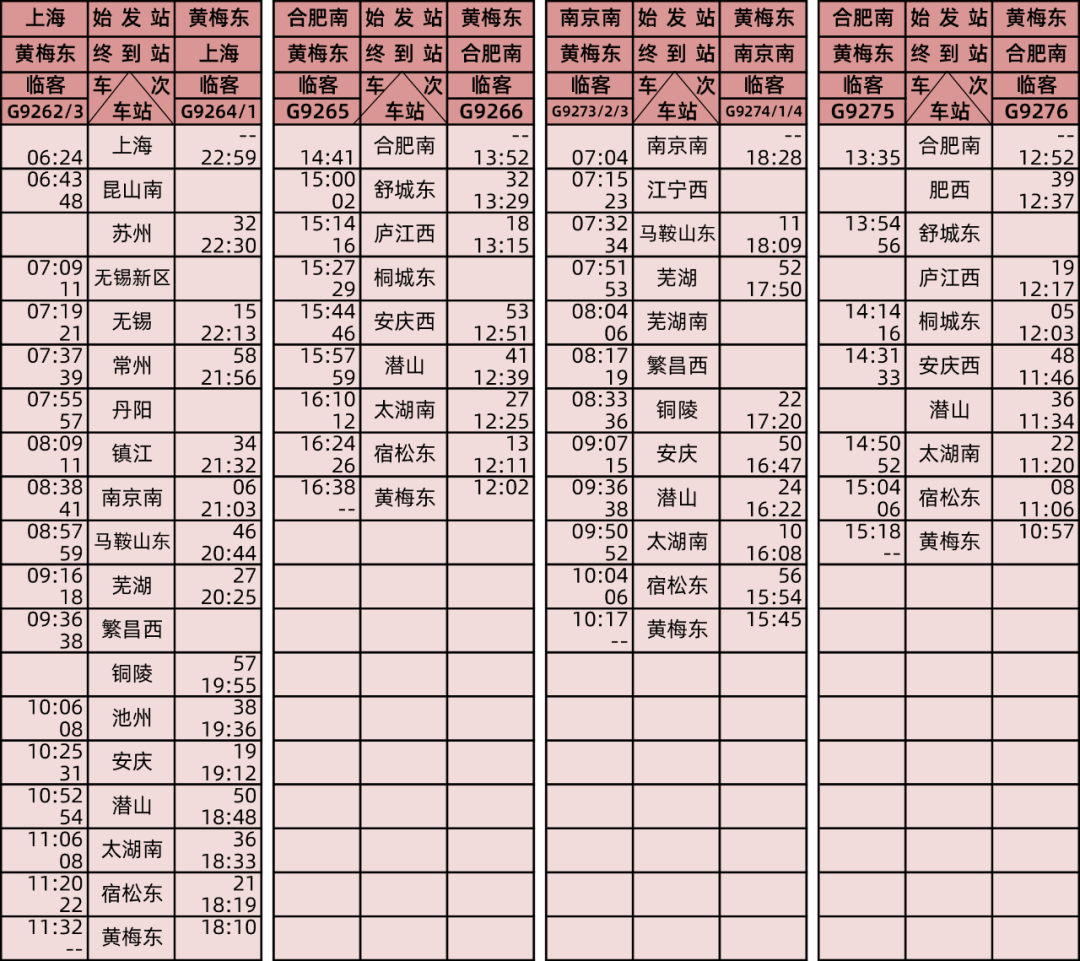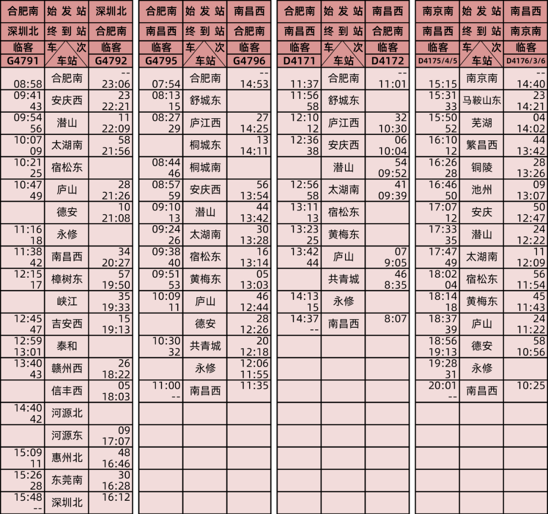 合肥到深圳1对、合肥到南昌2对、合肥到黄梅2对、南京到南昌1对、南京到黄梅1对、上海到黄梅1对