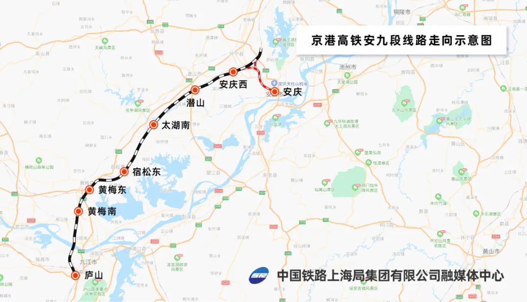 京港高铁安九段自安庆西站引出,经安徽省安庆市怀宁县、潜山市、太湖县、宿松县,湖北省黄冈市黄梅县,终至江西省九江市庐山站,线路全长176公里,设计时速350公里,全线共设安庆西、潜山、太湖南、宿松东、黄梅东、黄梅南、庐山7座车站,其中庐山站为既有车站。