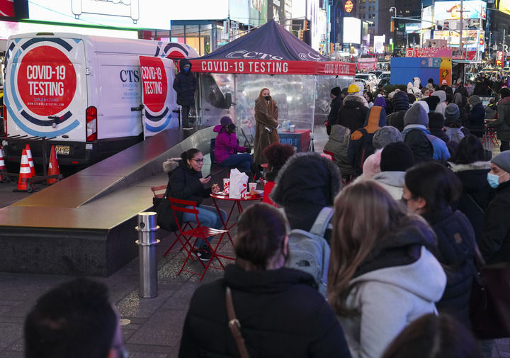 12月20日,人们在美国纽约时报广场排队等待进行核酸检测。新华社记者王迎摄