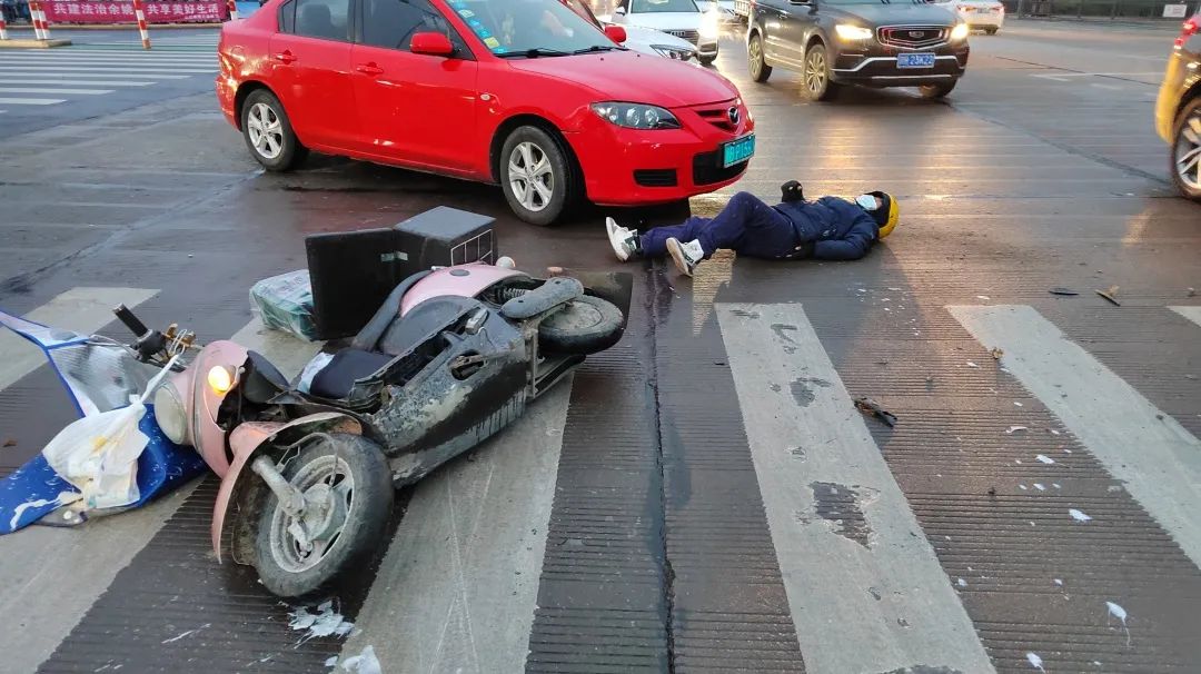 外卖小哥连车带人倒地