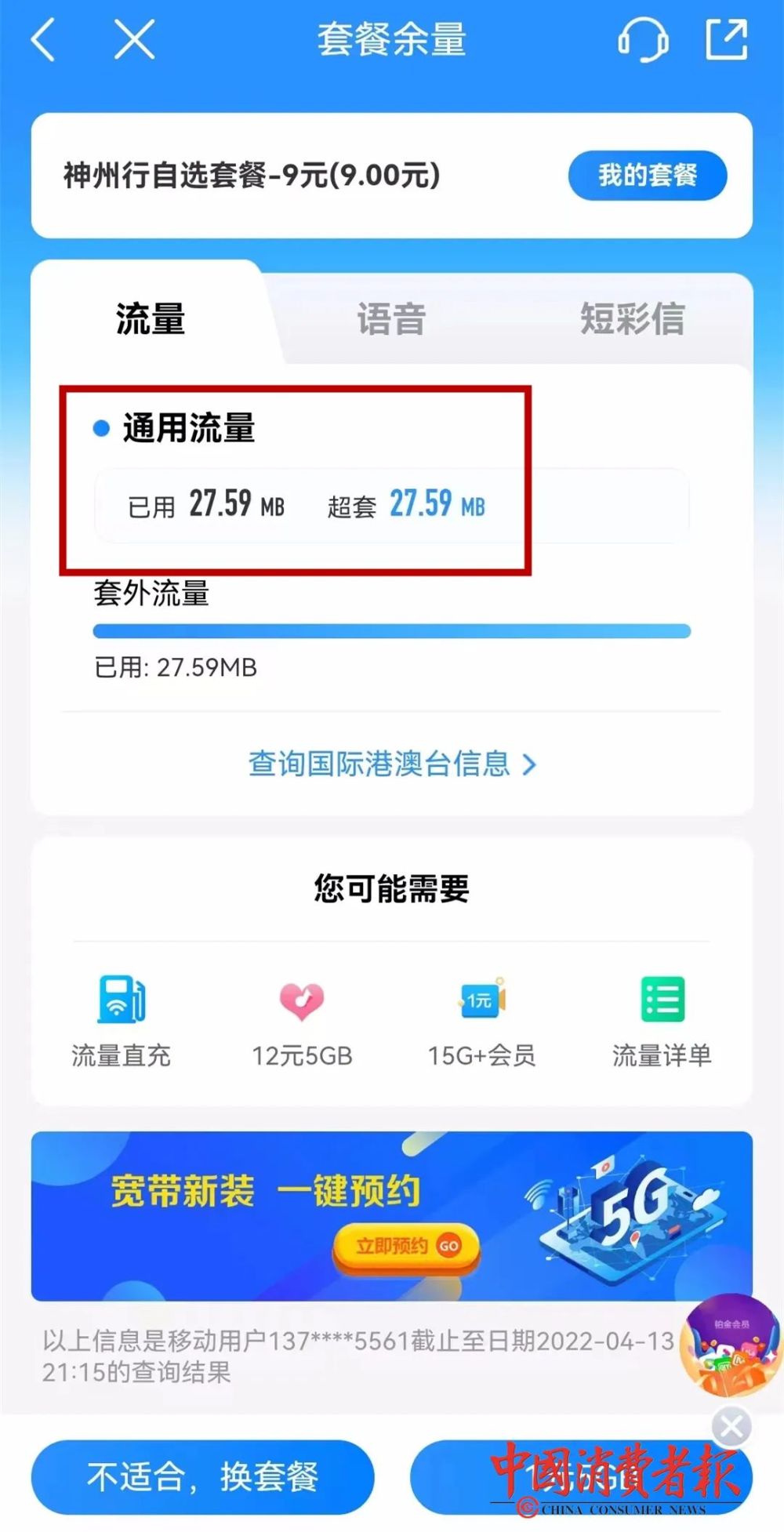 4月13号,李先生查看时套外流量统计还是27.59MB。资料图片