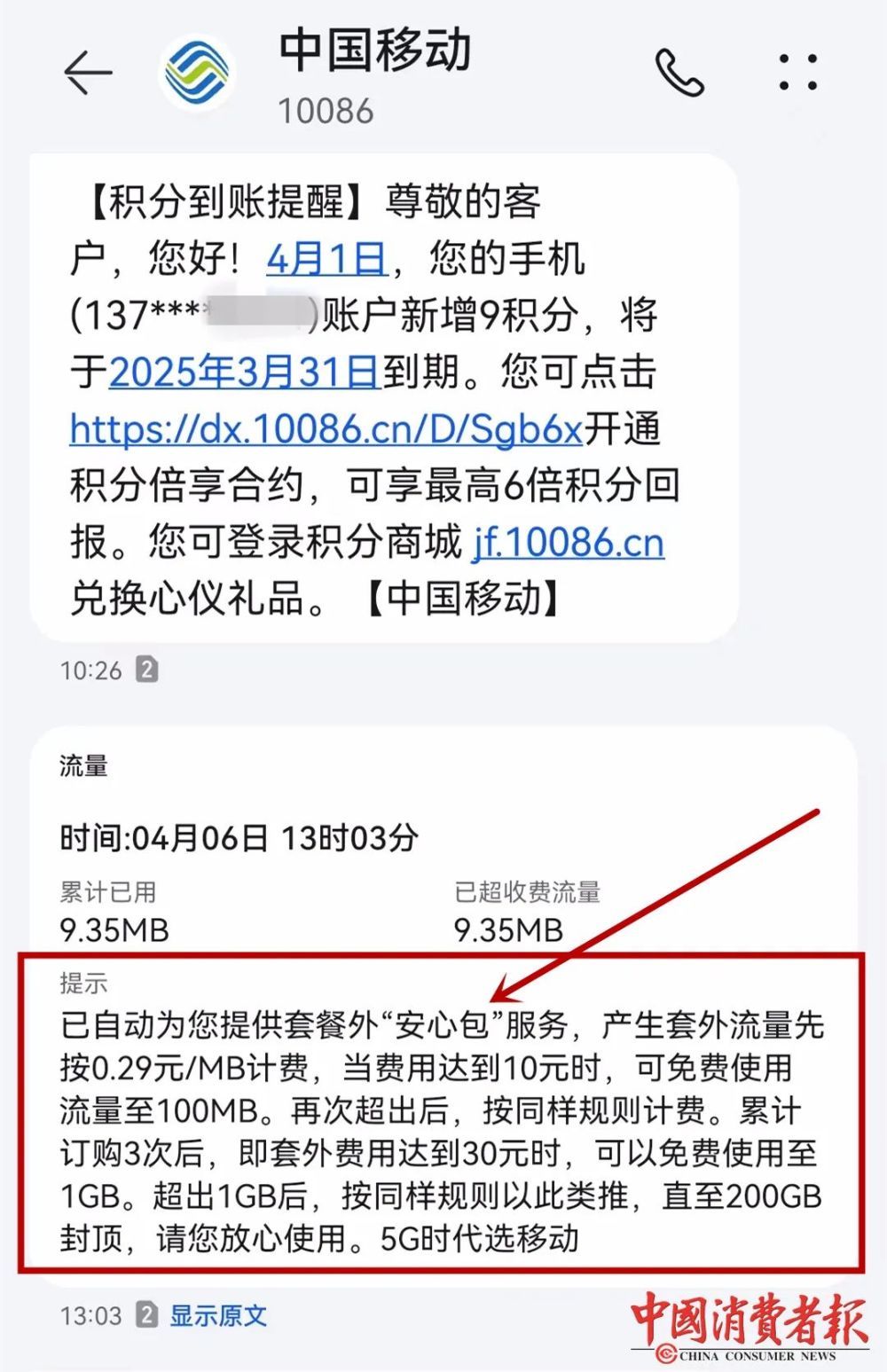 自己从不用中国移动手机卡上网,且数据流量一直处于关闭状态,手机自带的流量监测系统的监测数据为零,9.35MB的流量是怎么产生的?未经用户同意,中国移动为何自动开启“安心包”服务?