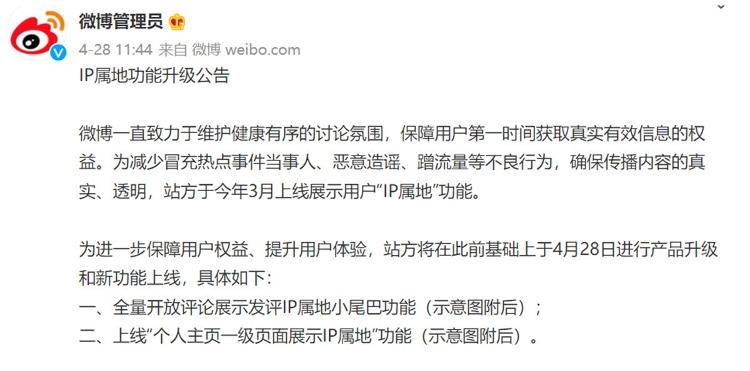 公告称,为了防治冒充热点事件当地网友的造谣传谣的行为,小红书将逐步开放该功能。展示的属地信息,主要以网络运营商的数据为准,同时指明不支持手动开启或关闭。新浪微博管理员在4月28日中午11时44分发出IP属地功能升级公告,宣布经过3月的测试之后,开始全量开放发评IP属地小尾巴功能,同时上线“个人主页一级页面展示IP属地”功能。