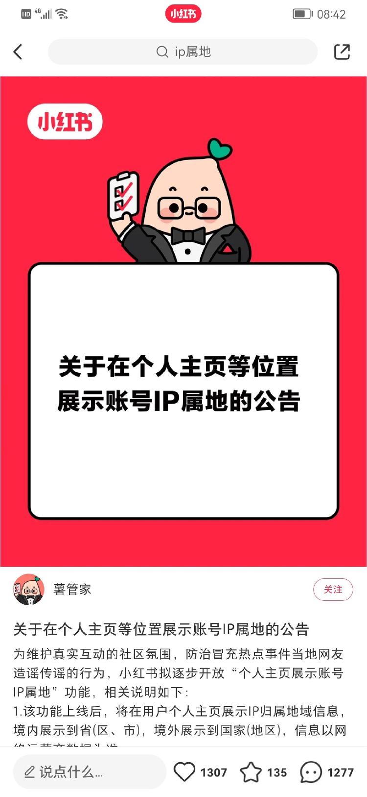 自今年3月起,就已经有平台开始测试展示账号IP属地功能。4月15日,小红书就发布了《关于在个人主页等位置展示账号IP属地的公告》。