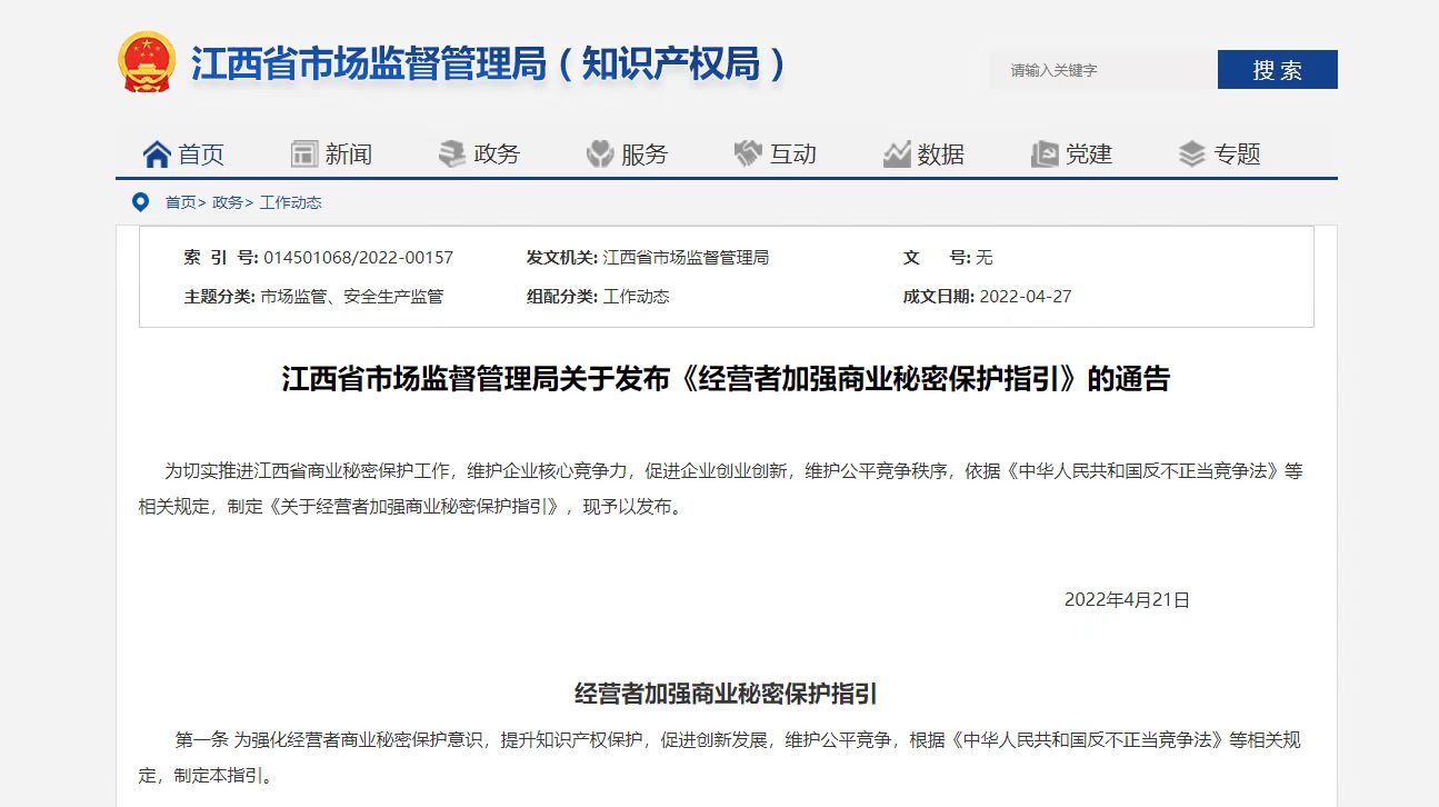 江西省为经营者加强商业秘密保护提供指引