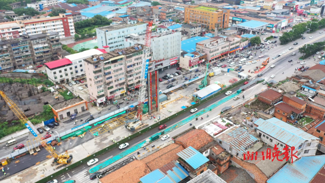 位于青山湖区解放西路与上海南路交叉路口以东,地下管线复杂,同时与居民区、商铺距离较近,沿街店铺与车站主体基坑最近距离仅8.8米,施工难度大。项目部不断优化交通疏解及管线迁改方案,同时,积极与城管局、交警队等政府有关部门协调,合理计划施工时间,尽力降低对周围住户及商铺的影响。