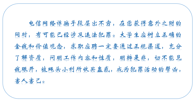 不要轻易添加自称“老师”的陌生人微信,不要轻易参加打着“兼职赚钱“幌子的培训班,更不要轻易在陌生网页及平台上转账汇款、办理贷款。如不慎踏入“培训贷”陷阱或者遇到疑似“培训贷”诈骗的情形,应积极收集并留存有关证据,涉嫌诈骗的应向公安机关报案,勇于用法律手段维护自己的合法权益。