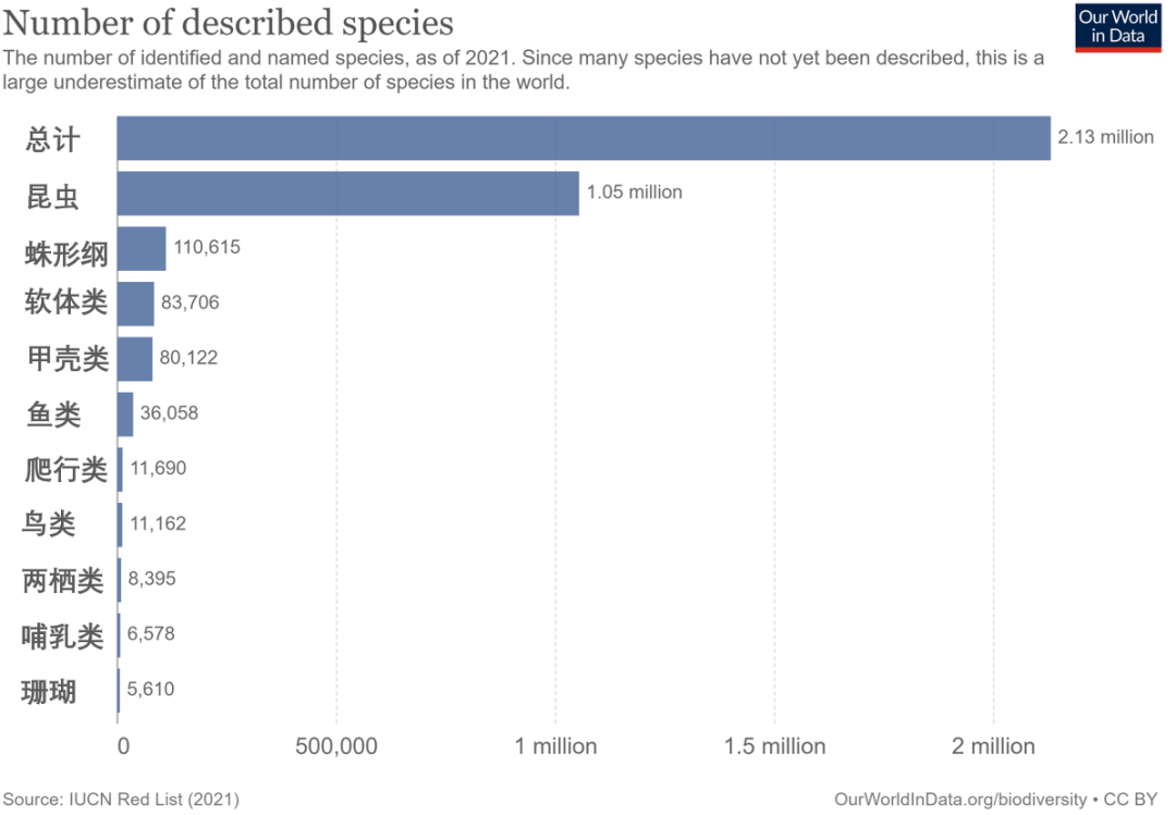 从这张图片中,我们不难发现在全球已描述的动物物种中,昆虫物种数量不仅位列榜首,而且相当于其他已描述物种数量之和!