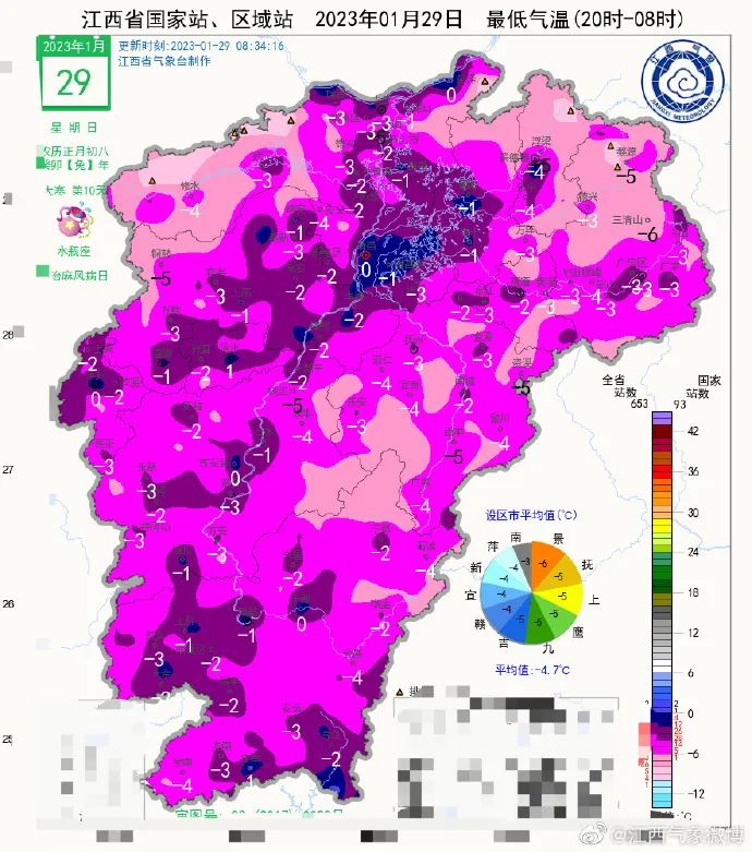 明天最低温度:赣北和赣中东部零下3℃~零下1℃;全省其他地区0~2℃,局部零下1℃。