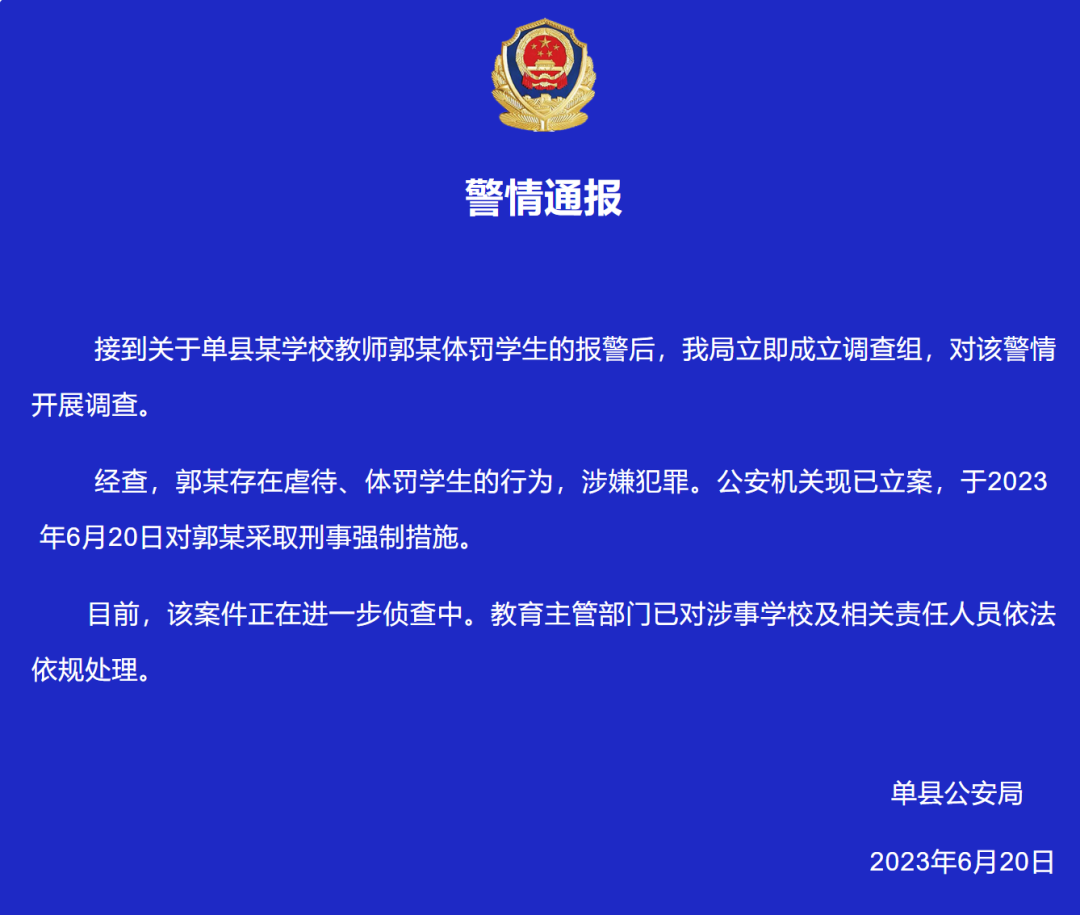 近日,网传山东菏泽单县北辰实验学校二年级一8岁男孩遭老师多次殴打、针扎。6月20日,单县公安局就此事发布警情通报。