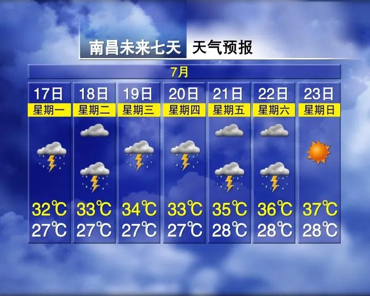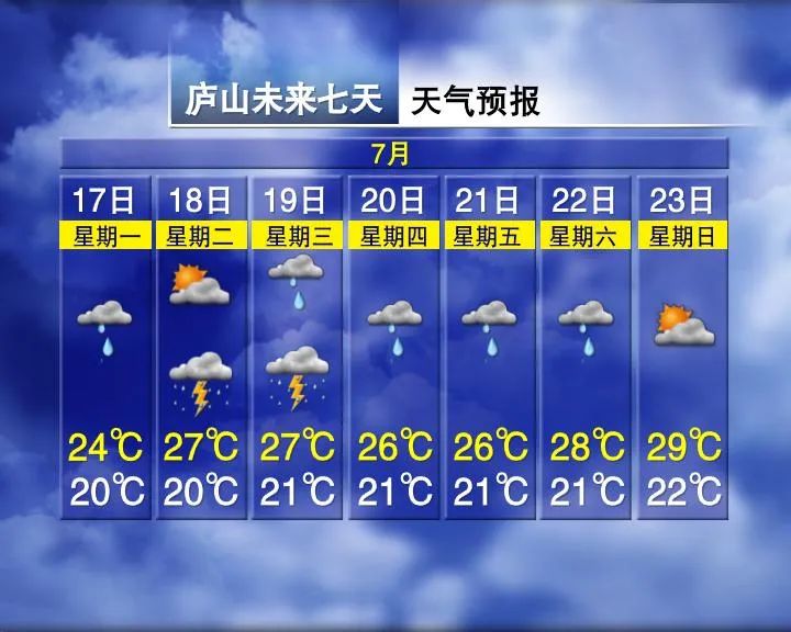 九江市北部阴天有阵雨或雷阵雨,局部地区有大到暴雨或短时强降水;全省其他地区多云,大部分地区转阵雨或雷阵雨,部分地区有中到大雨,局部地区有暴雨或短时强降水,并可伴有强雷电、雷暴大风。