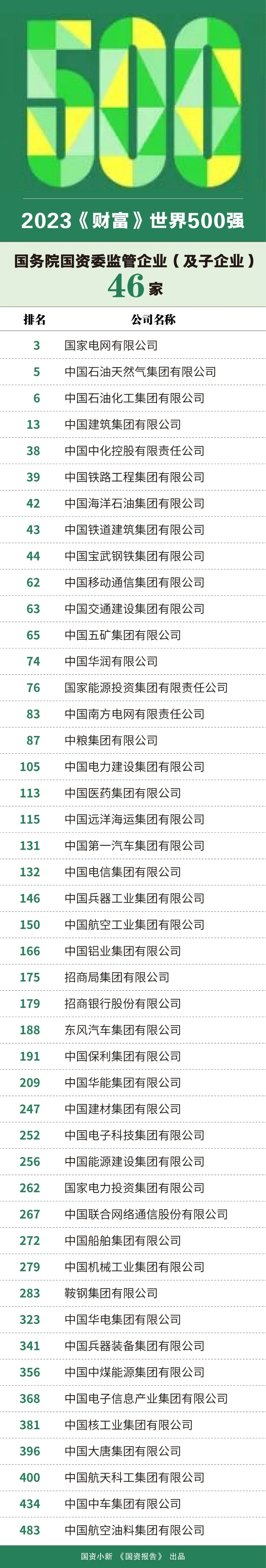 本年度《财富》世界500强中,加上台湾地区企业,我国共有142家公司上榜,数量继续位居各国之首。同时,共有97家国有企业上榜。其中:国务院国资委监管的央企(含招商局集团旗下的招商银行)46家;地方国资委监管的地方国企39家;财政部监管的金融等企业11家,另有福建的兴业银行。
