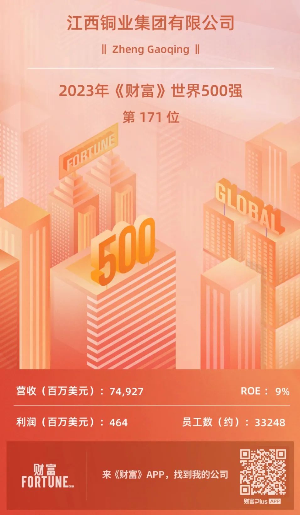 8月2日,2023年《财富》世界500强排行榜发布。江西铜业集团有限公司以2022年度749.272亿美元的营业收入排名第171位,比去年前移5位。这是江铜连续11年跻身《财富》世界500强。