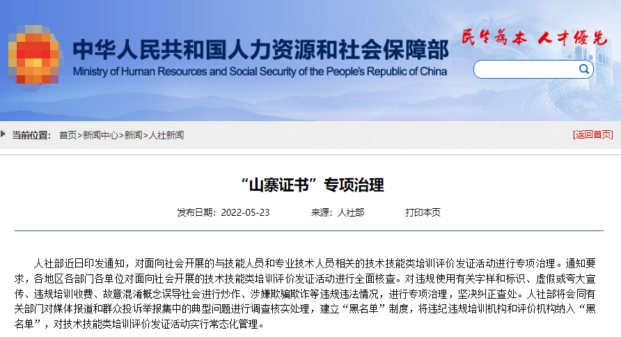 人社部此前一直在进行“山寨证书”专项治理行动,考试中心联合有关部门持续加大对“山寨证书”的打击力度,对发现的假冒网站等线索,坚持一查到底、深挖彻查。