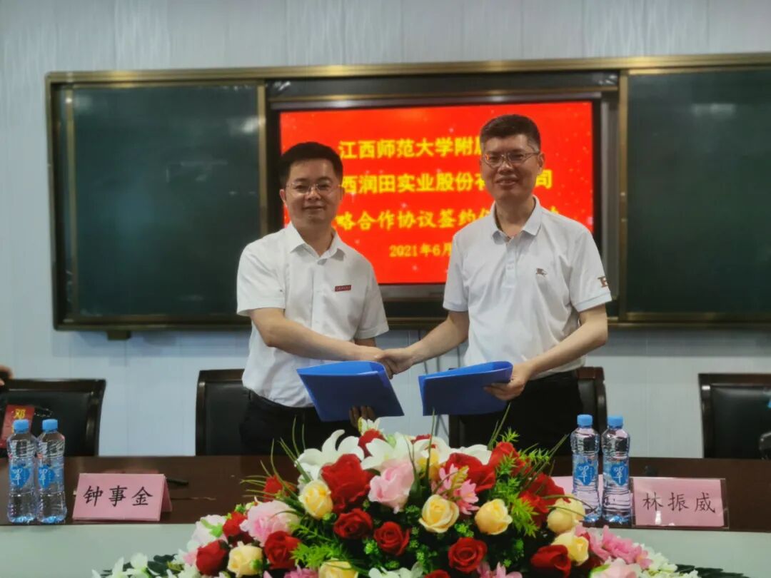 ▲签约现场:江西师大附小校长钟事金及江西润田公司副总经理林振威