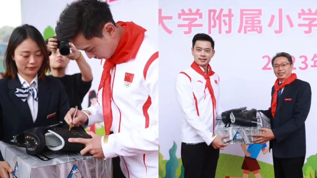 ▲运动员金杨向江西师大附小甘党根书记赠送签名滑冰鞋