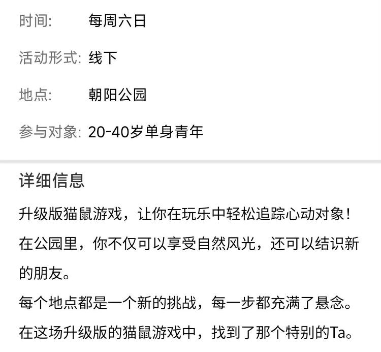 与此同时,活动组织者也在有意提升活动社交价值。部分活动征集帖中明确写道,“仅限20-40岁单身人士参与。”