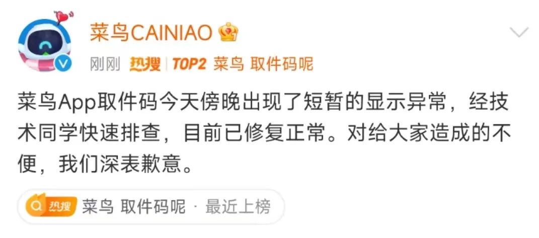 12日晚9时许,菜鸟官方微博发文表示:“菜鸟APP取件码今天傍晚出现了短暂的显示异常,经技术同学快速排查,目前已修复正常。对给大家造成的不便,我们深表歉意。”