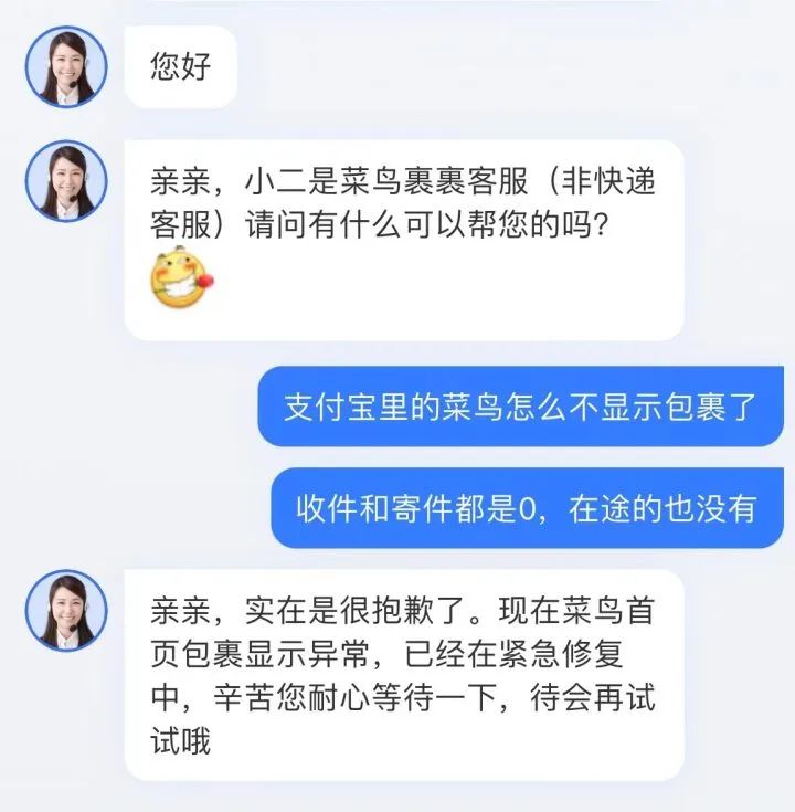 记者询问菜鸟客服得知,菜鸟首页包裹显示异常,已经在紧急修复中。