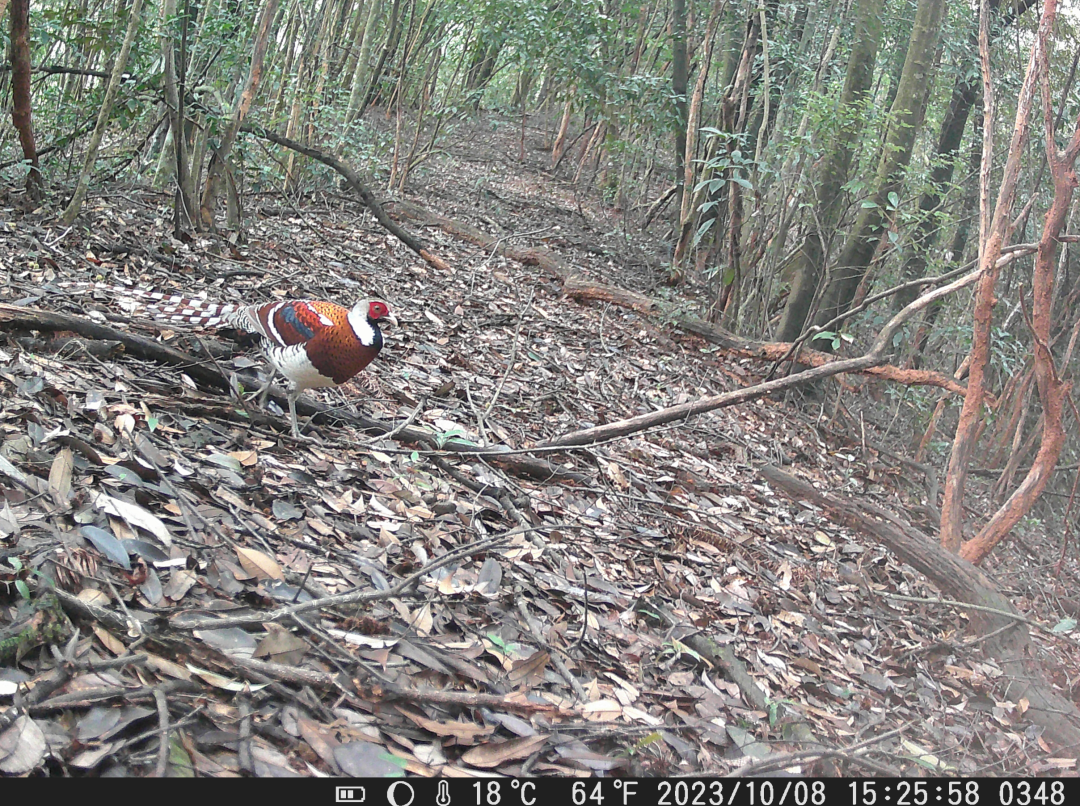 除了黑麂外,这次红外监测设备红外相机0348号2023年10月8日15时26分还拍摄到一只白颈长尾雉,非常漂亮,也是国家一级保护野生动物。