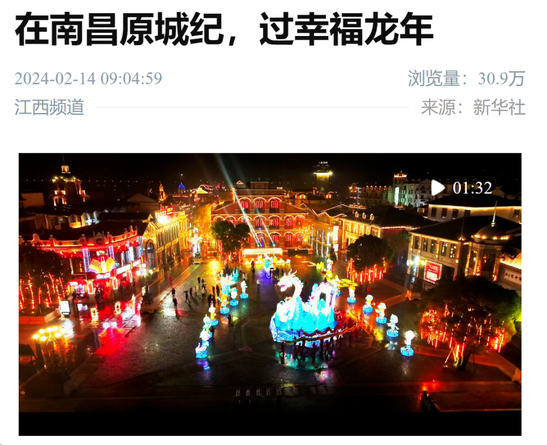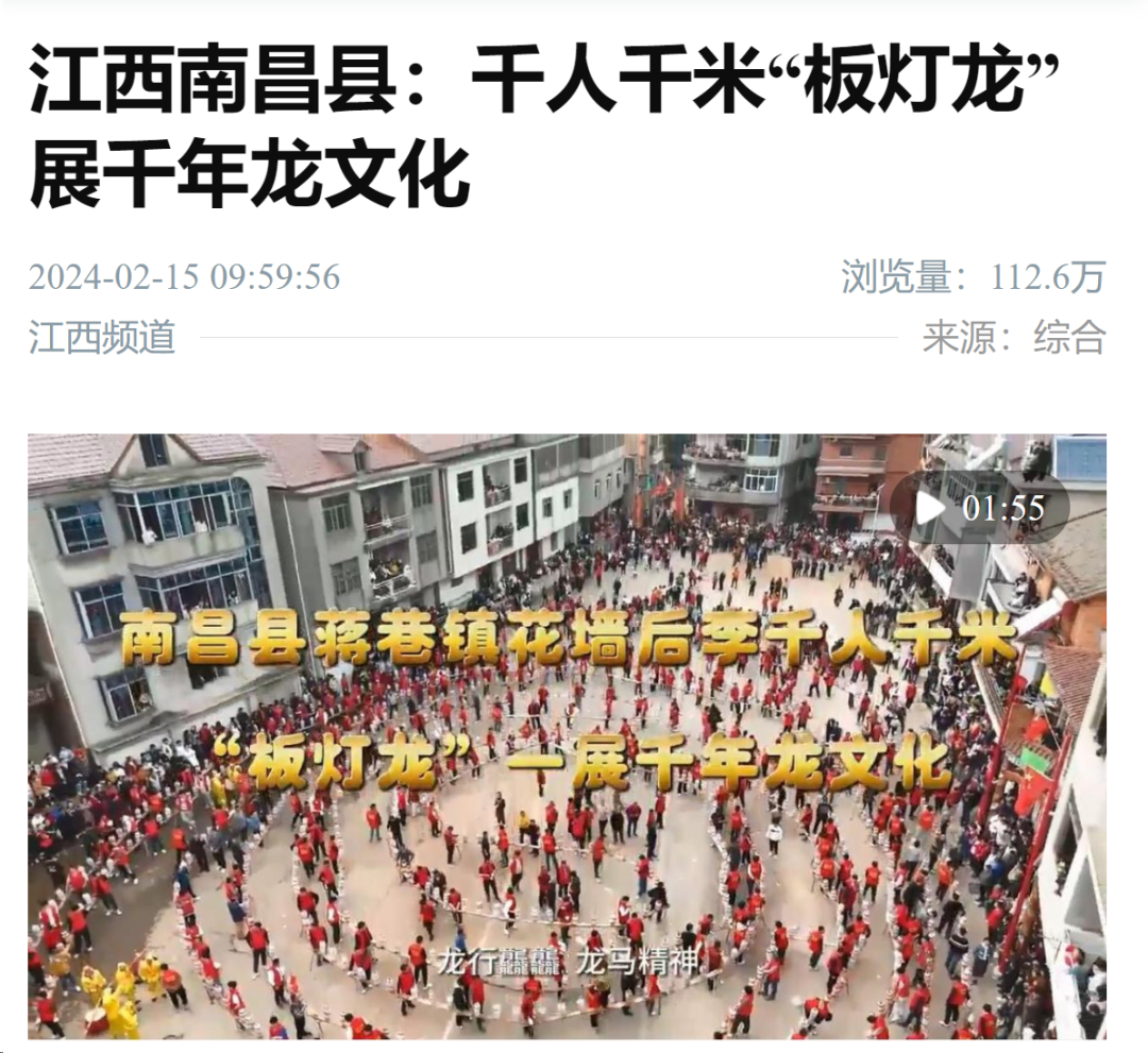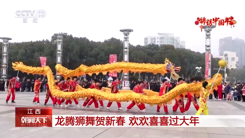 2月10日,央视《朝闻天下》报道:龙腾狮舞贺新春,欢欢喜喜过大年。新春佳节,“舞龙舞狮迎新春”展演活动在南昌县热闹举行,来自南昌县11个乡镇的舞龙舞狮队伍穿梭于人群中,他们身着五彩斑斓的服装,一条条金龙在他们手中时而上下翻腾、时而如灵蛇般穿梭舞动,赢得现场观众阵阵喝彩。