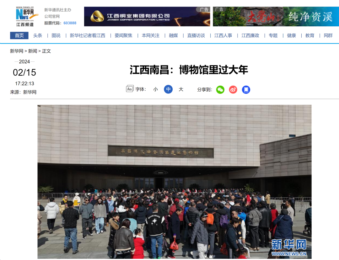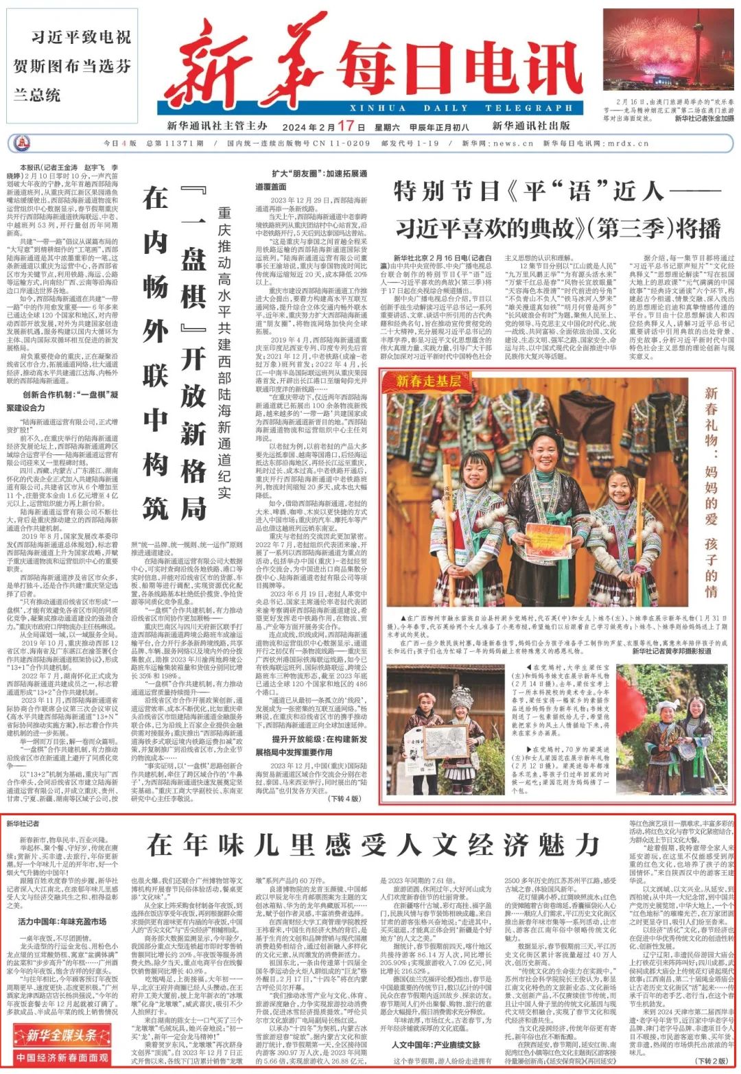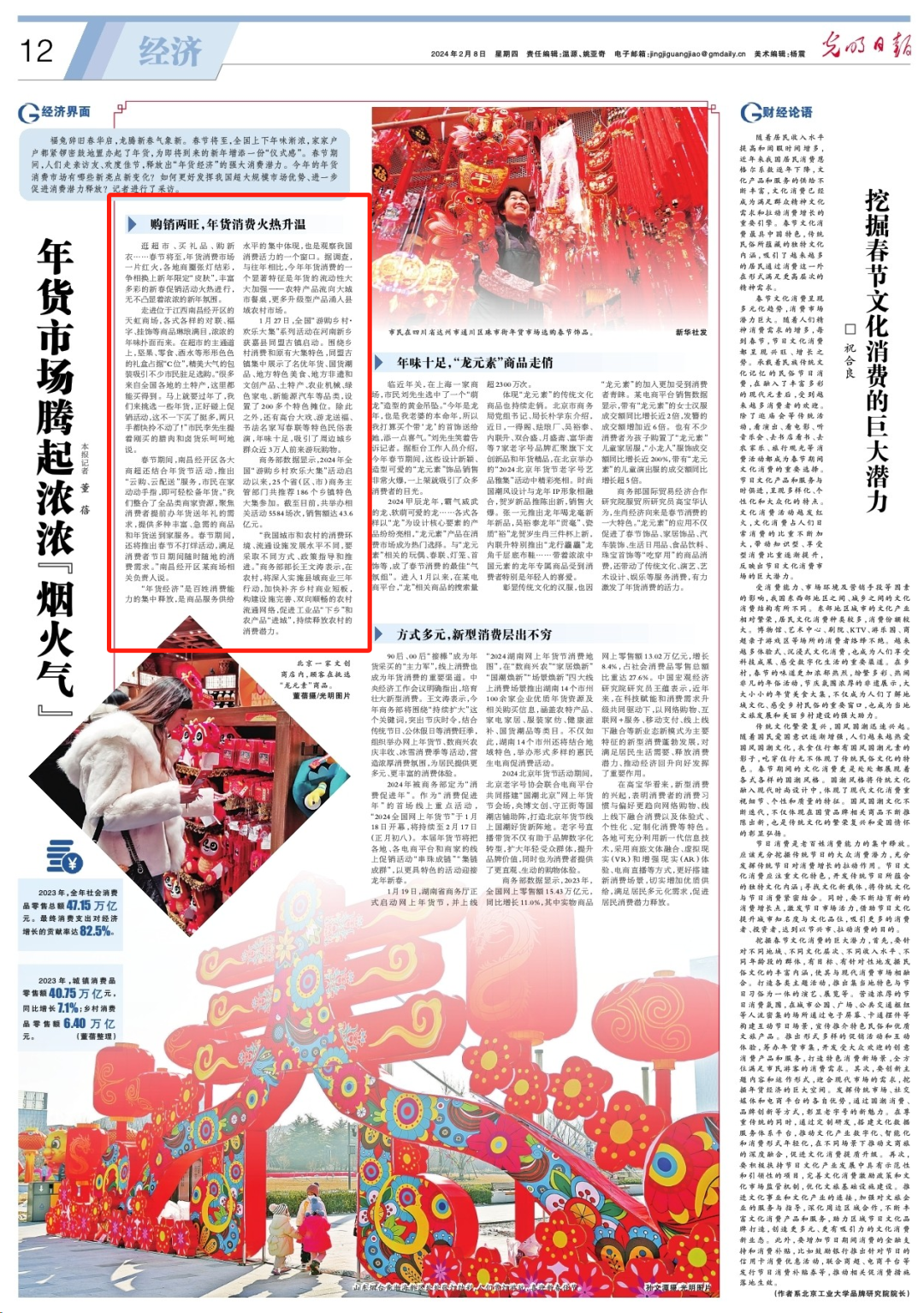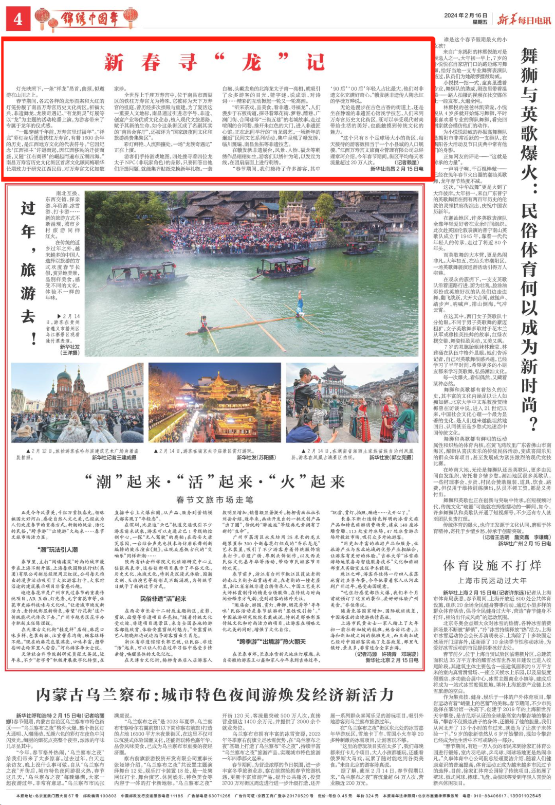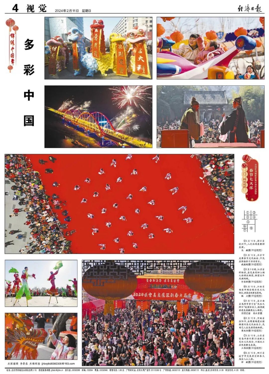 2月17日,《新华每日电讯》1版其他位置刊发题为《在年味儿里感受人文经济魅力》的文章,其中提到:辽宁辽阳,非遗民俗游园大庙会上打铁花引来阵阵叫好;四川成都,武侯祠成都大庙会上传统花灯讲起现代故事;江西南昌,第二十届绳金塔庙会让古老历史文化街区“活”起来……传承千百年的老手艺、老行当,在这个春节生机勃发。