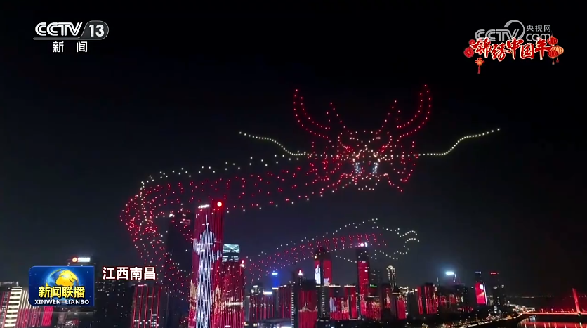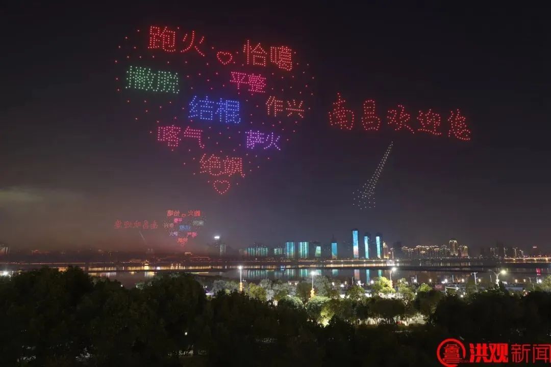 2400架无人机在夜空中编队、悬停,依次变幻出“祥龙腾飞”“南昌味道”“福娃送福”“南昌欢迎您”等主题的图案和字样。每一次图形转换,都引得现场观众一阵欢呼。许多人的朋友圈被南昌这场无人机编队飞行表演刷屏。