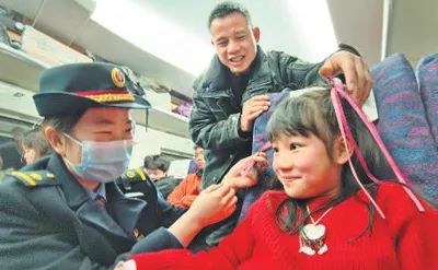 2月12日,《人民日报》头版其他位置刊发题为《多彩活动共庆新春 千家万户和美过年(新春走基层)》的综合稿件,其中配图:大年初二,江西南昌开往福建福州的D6501次列车上,乘务人员给小旅客佩戴中国风头饰。