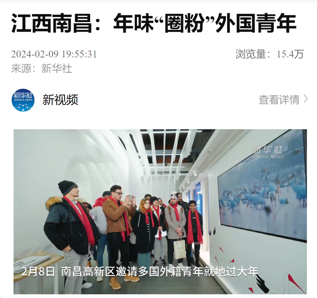 观白鹤、剪窗花、包饺子……2月8日,来自巴基斯坦、俄罗斯、土耳其等国的外籍青年在南昌高新区过大年,体验中国传统年俗文化。