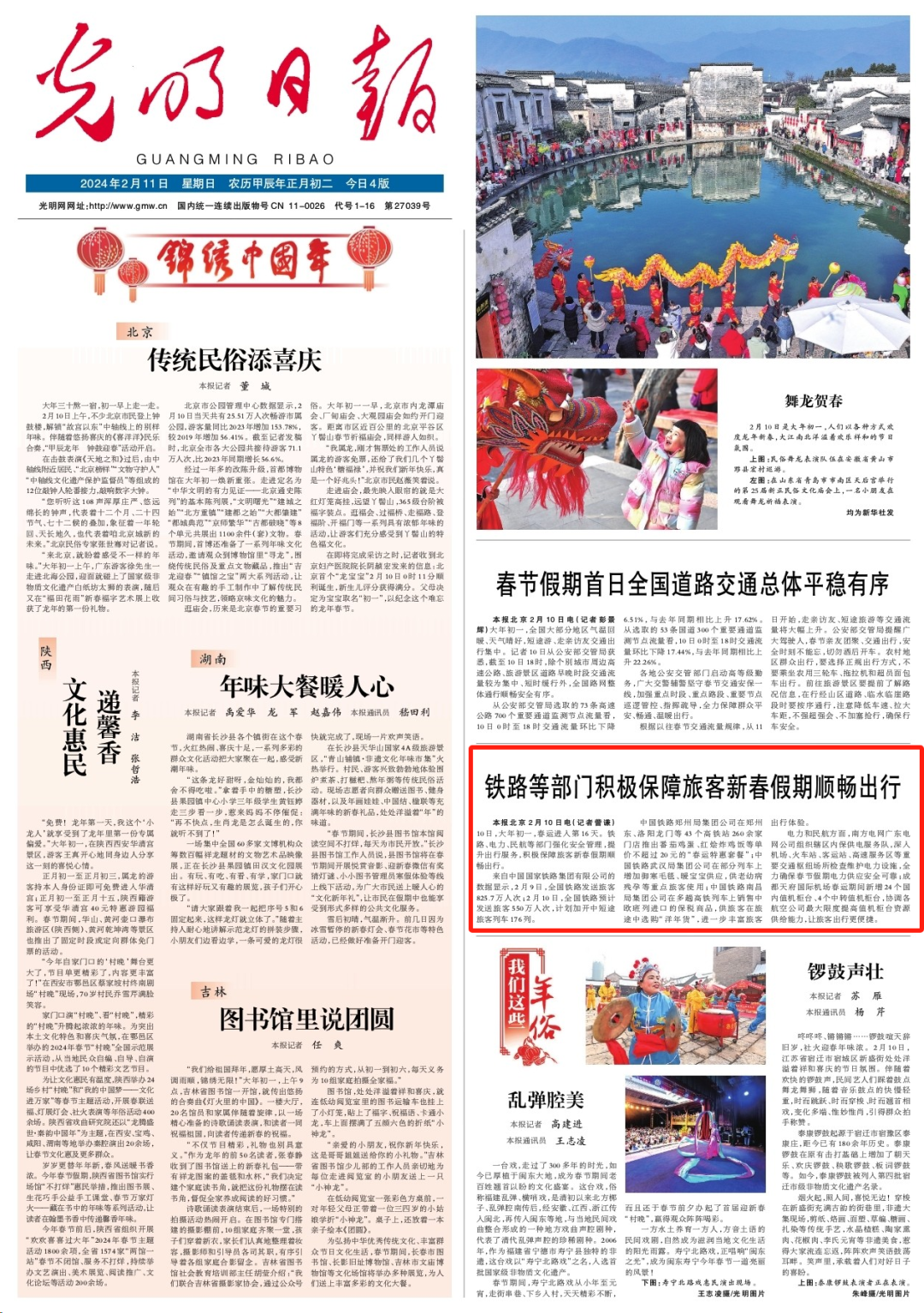 2月14日,《人民日报》2版图片新闻提到:春节假期,200多万名铁路职工坚守岗位,助力旅客便捷出行,确保铁路运输安全平稳有序。为满足春节假期旅客需求,各地铁路部门积极开行各具特色的旅游列车,让旅客在旅途中感受自然风光、观赏民俗文化、品尝特色美食。