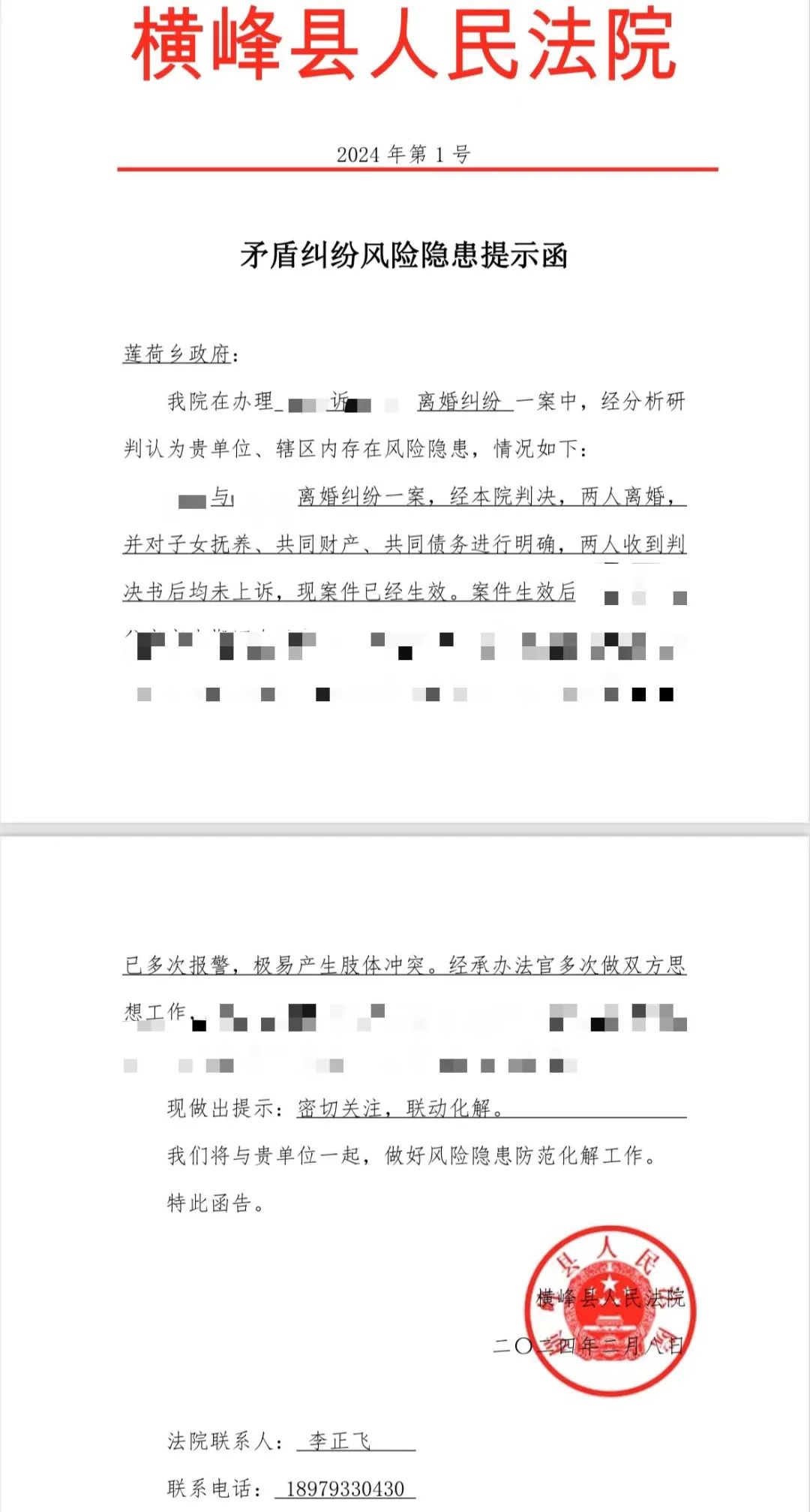 为真正实现“抓前端、治未病”,推动矛盾纠纷实质性化解,近日,横峰法院岑阳法庭就审理的一起离婚纠纷案件向莲荷乡政府发出首份矛盾纠纷风险隐患提示函。