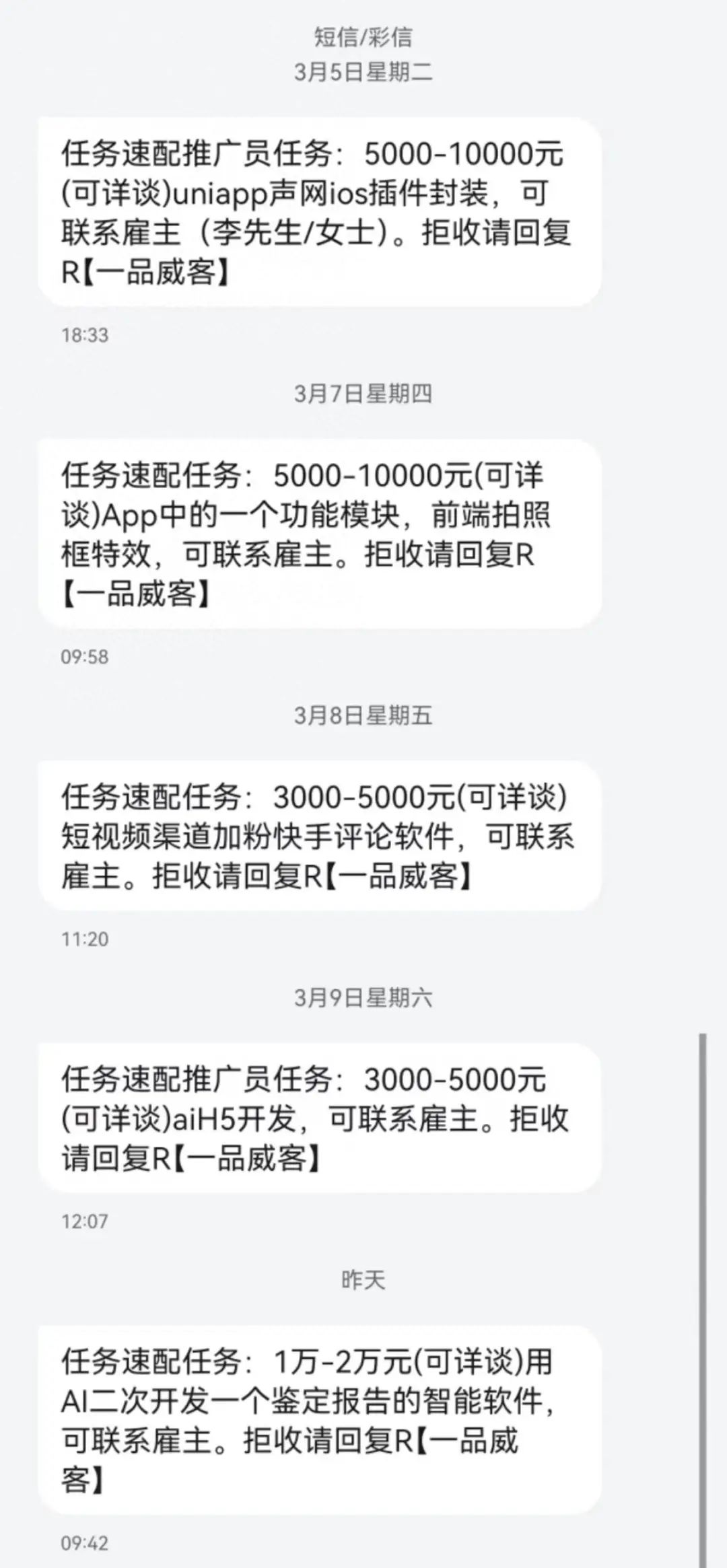 李先生提供的短信截图显示,2月11日至3月10日,一品威客平台共向其推送31条订单信息,其中2万元以下的订单有24条,占比77%。5万元~10万元的订单只有3条。