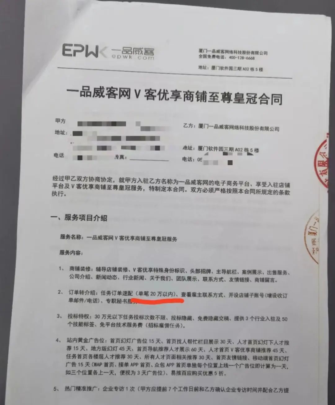 李先生与一品威客签订的《一品威客网V客优享商铺至尊皇冠合同》显示,一品威客将提供订单转介绍服务,该服务包含任务订单速配(单笔20万以内)、查看雇主联系方式、开设店铺子账号(增设收单邮箱/电话)、专职秘书服务。“我觉得他们玩文字游戏玩得很溜,几千块钱确实算20万以内。”李先生气愤地说。