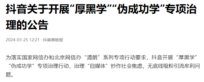 3月25日,抖音官方发布《关于开展“厚黑学”“伪成功学”专项治理的公告》,表示将专项治理“自媒体”炒作社会焦虑,无底线吸粉引流牟利问题。