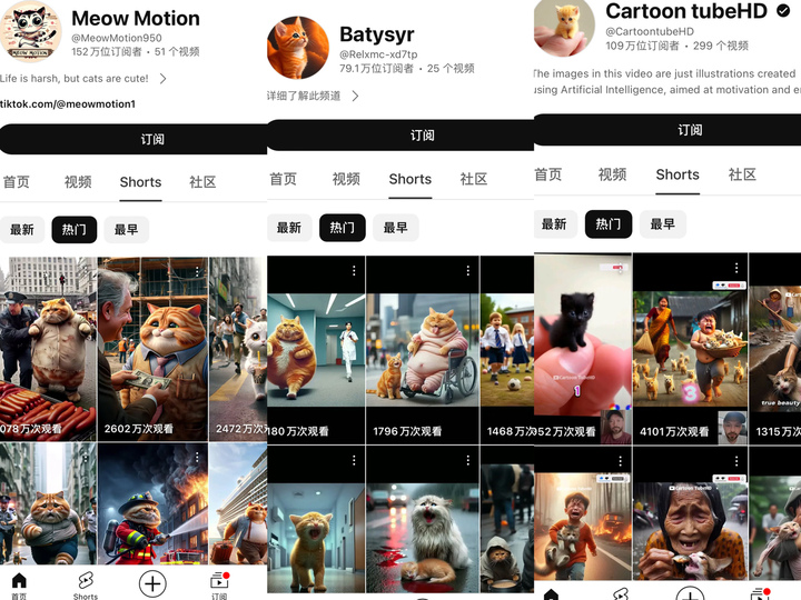 有风君搜索发现,这类账号运营时间并不长,大多在去年创立,并在短短半年时间迅速起号涨粉,比如博主Meow Motion创建账号三个月内就达到150多万的订阅量,并且其账号排名前十的热门作品中,AI猫猫剧情视频播放量都达到了千万级。