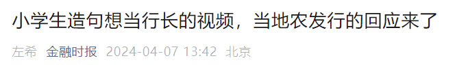 男孩“想当行长继承家业”,农发行正式回应!2024-04-07 14:35 阅读 “金融时报”微信公号 针对近日大家关注的小学生填词造句视频,中国农业发展银行安徽省分行新闻发言人接受了《金融时报》记者采访,对大家关心的问题作了回应。 他表示,中国农业发展银行(以下简称“农发行”)共设四级机构,总行、省分行、地市分行、县支行。四级行的经营负责人职务都称行长,县支行员工数量一般为15人左右。经排查,视频中的学生确实是该行员工的孩子,其父亲是某县支行行长,母亲是某市分行机关部门副主管,孩子的爷爷、外公曾经是农发行员工,均已退休多年,其爷爷是支行普通员工、外公曾担任过另一县支行行长。 该发言人表示,孩子父母目前的工作岗位符合监管要求和农发行任职回避制度规定,为此他们处于异地工作状态。 该发言人还进一步解释称,这一家庭在农发行工作的成员比较多是过去近三十年来历史变迁和员工联姻形成的。老一辈员工即孩子的爷爷和外公是农发行支行成立时随业务由其他行划转到农发行的,目前已分别退休20年、8年。孩子父母是学校毕业后通过招聘进入农发行工作的,此后相互认识结婚,进一步增加了这一家庭的农发行员工数量。历史上部分机构对亲属关系管理要求不严,禁止性规定欠缺,早期子承父业传统思想仍有一定影响,再加上同一单位年轻人恋爱结婚,形成了有的员工一家人在农发行人数较多的情况。针对部分员工存在亲属关系对经营管理带来的不利影响,2019年,农发行总行出台了严格的禁止准入规定,无论是校招还是社招等各类形式招聘,应聘人必须承诺在农发行没有组织人事部门规定的近亲属,否则一律不予录用,如隐瞒不报发现后一律除名。规定发布后,安徽省分行严格执行总行规定,此后除行内恋爱结婚外,不允许有新的亲属关系增量发生。同时对于存量亲属关系,根据组织人事部门规定,制定了明确的回避制度,安徽省分行也严格执行,一旦发现问题将立即纠正。 该发言人最后强调,严禁准入和严格回避这两项规定是农发行现行重要人事制度,农发行有信心坚持好、执行好这一制度,营造更加公平的员工招录和成长环境,为服务经济社会发展提供坚强有力的保障,也欢迎社会各界监督。 “金融时报”微信公号截图 编辑:张文静 审核:倪旻 打开APP阅读全文