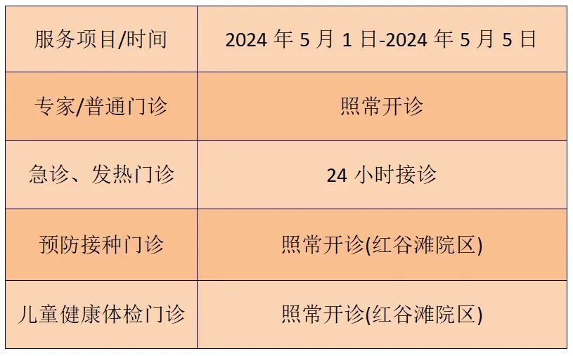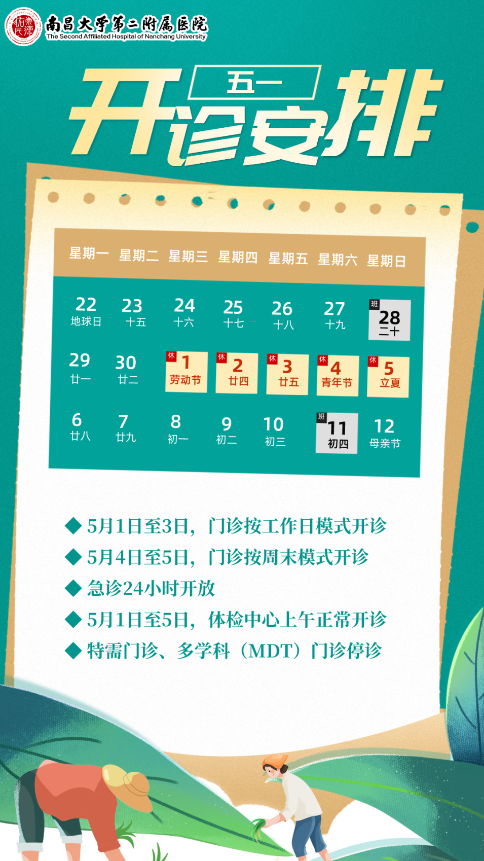 2. 5月4日(星期六)、5月5日(星期日)按照周末模式上午开诊,下午休息。
