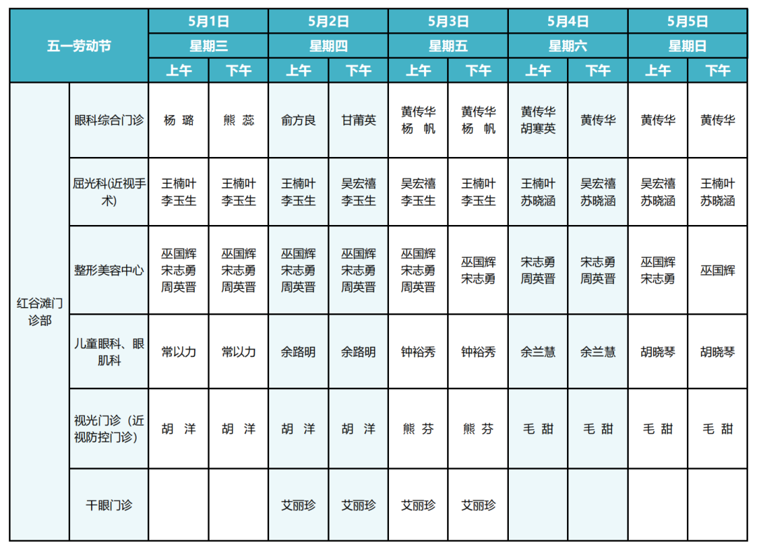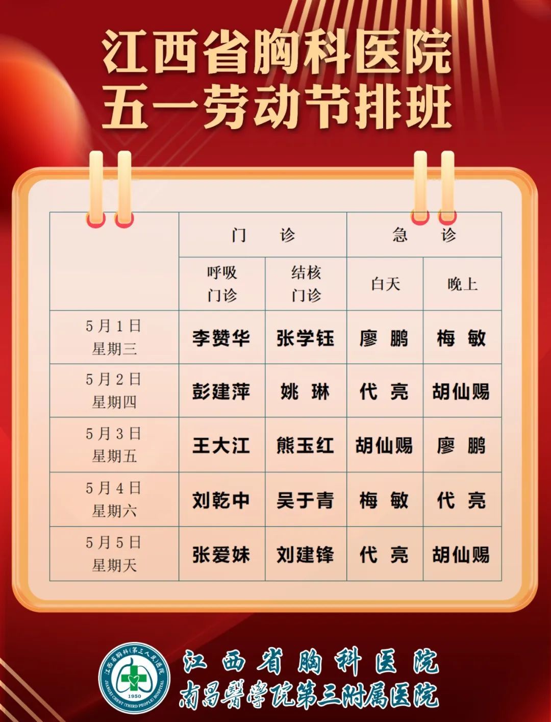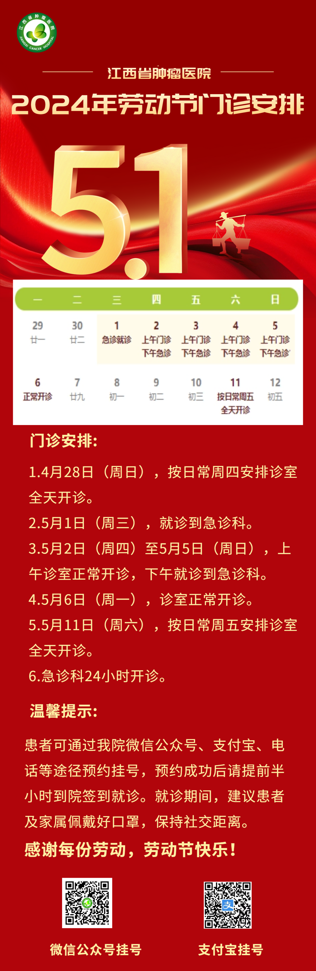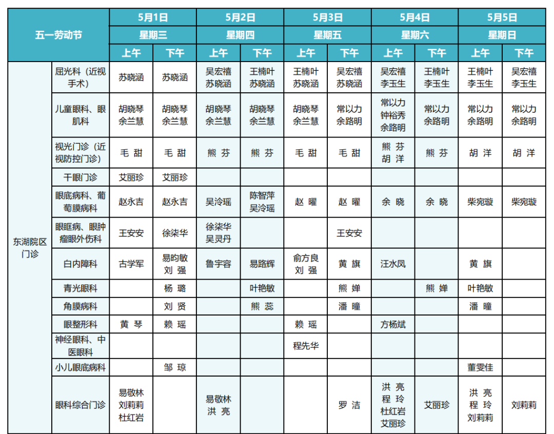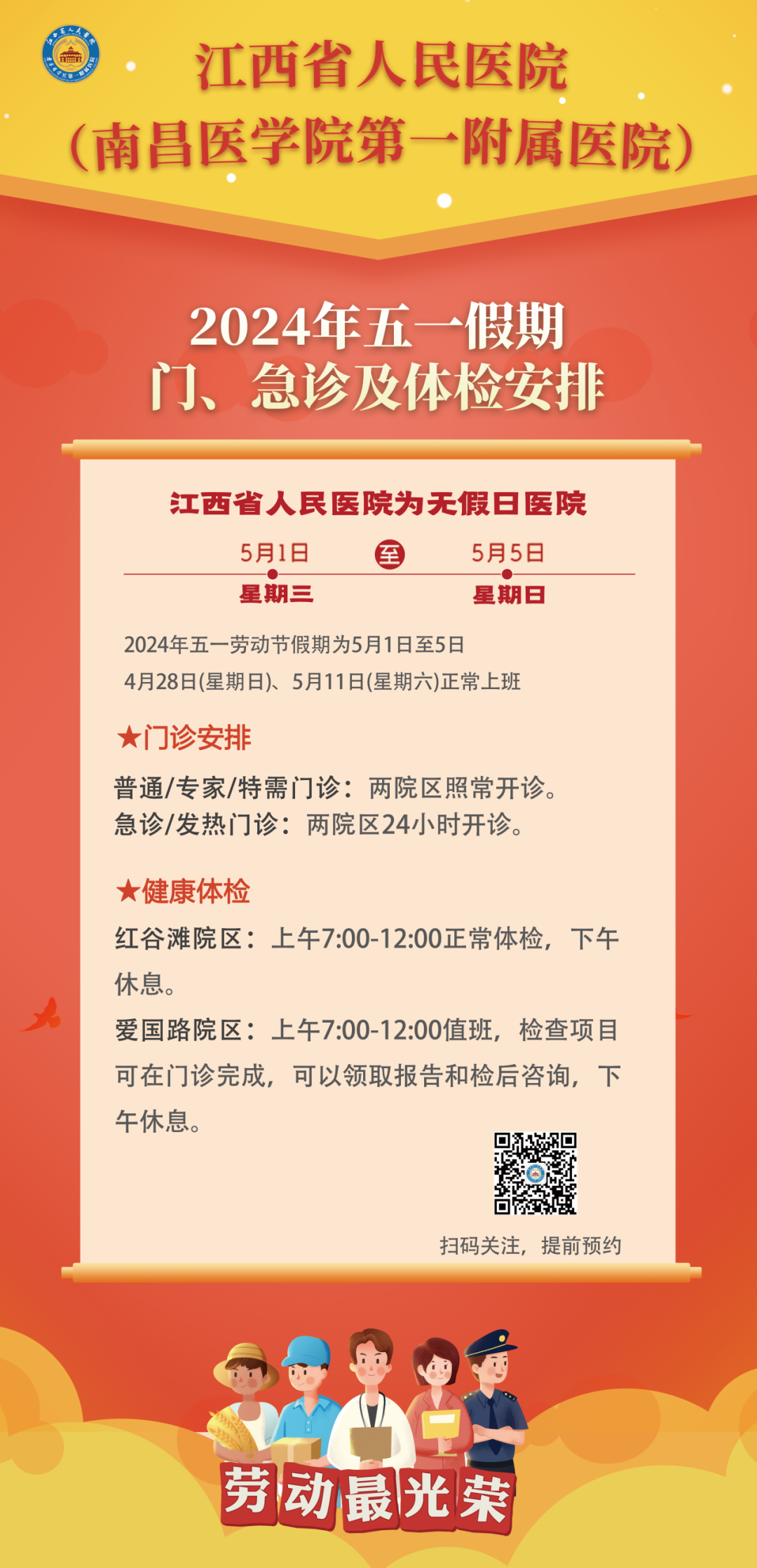 2.2024年5月2日(周四)至5月5日(周日),东湖院区、红谷滩院区及世贸路门诊部按双休日排班正常开诊;