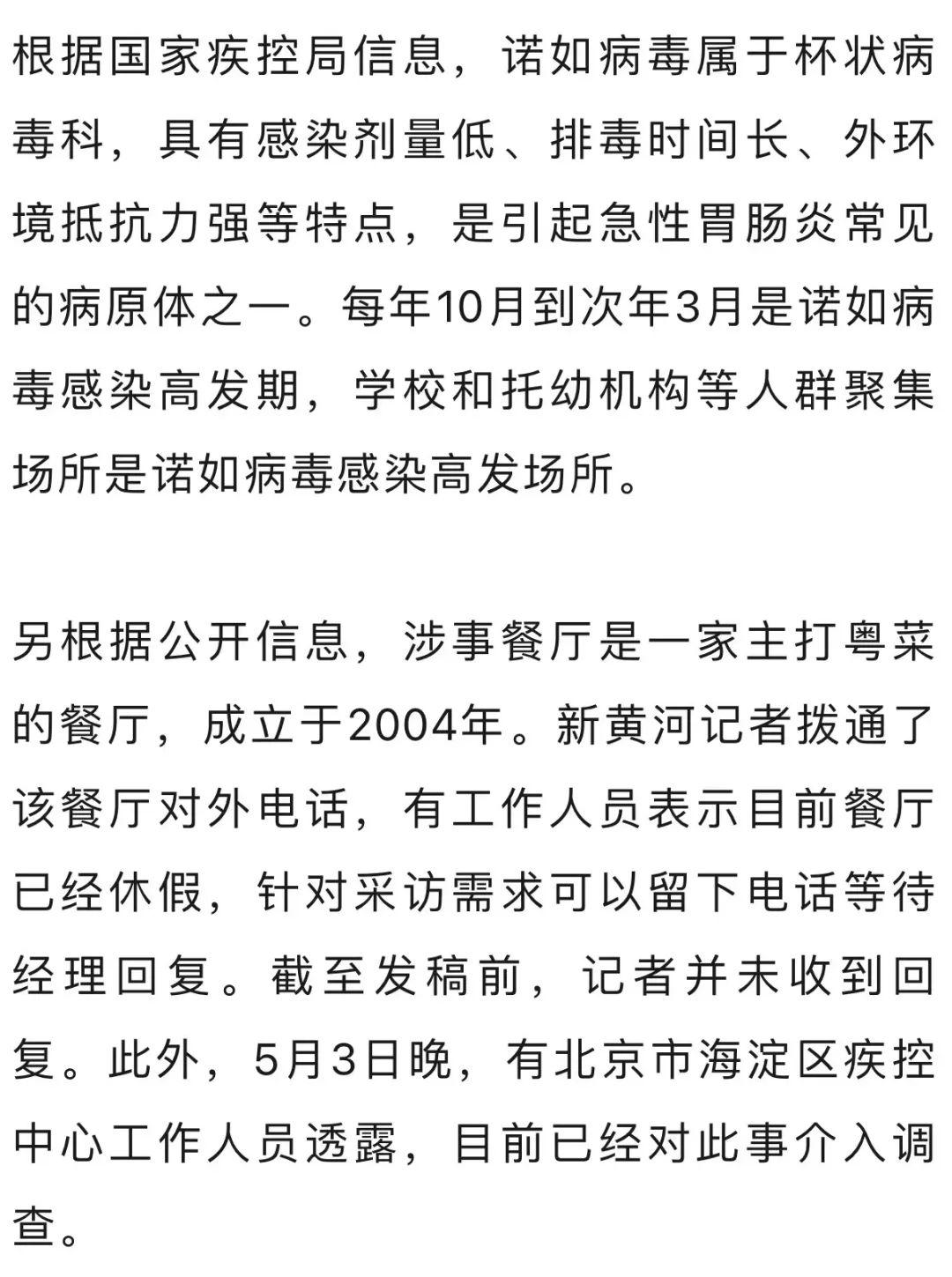5月3日晚,北京市海淀区疾控中心一工作人员透露,针对此事已介入调查。5月4日,有用户在大众点评该餐厅下评论称:北京市场(监督)管理局和北京疾控开始了一轮大面积调查取证。