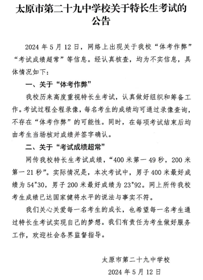 12日晚,太原市第二十九中学校就此发布公告称,网络上出现关于该校“体考作弊”“考试成绩超常”等信息。经认真核查,均为不实信息。考试过程全程录像,每名考生的成绩均可通过录像查询,不存在“体考作弊”的可能性。