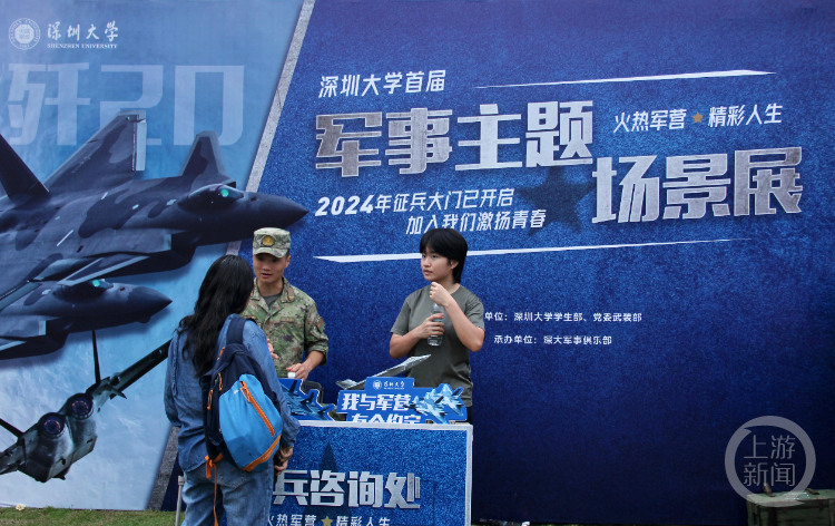 深圳大学官网介绍,5月20日-26日期间,深圳大学在粤海、丽湖两校区先后开展征兵主题活动,活动由深圳大学学生部、武装部主办,深大军事俱乐部承办。在深圳大学粤海校区活动现场设置了歼-20战机模型参观及驾驶舱上机体验、95式步枪模拟射击体验、“我与军营有个约定”主题“打卡”和征兵咨询等活动。